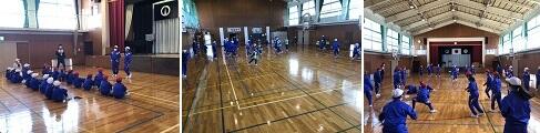 3年生体育・・・かべや床を使ってドリブルの練習をしています。