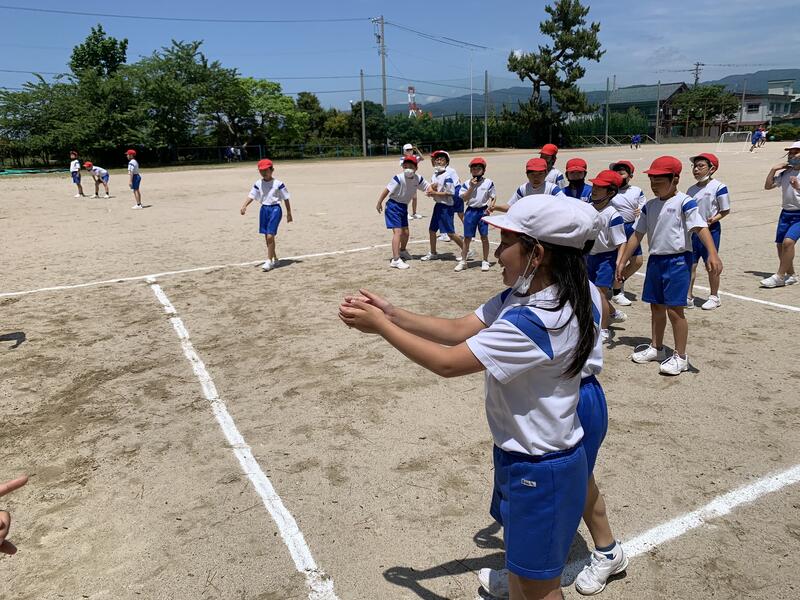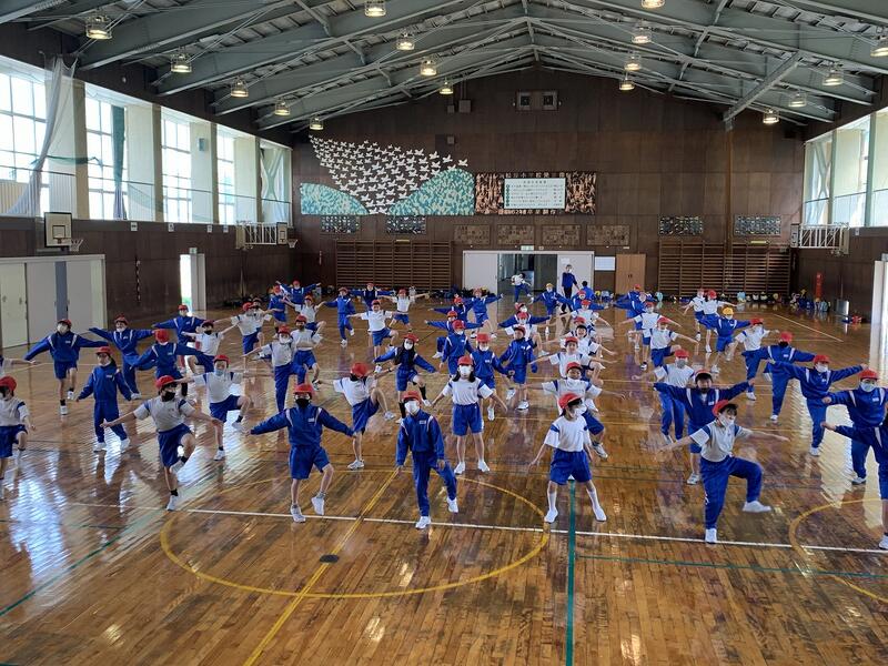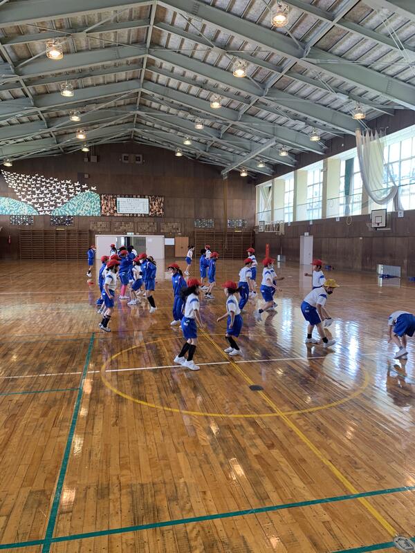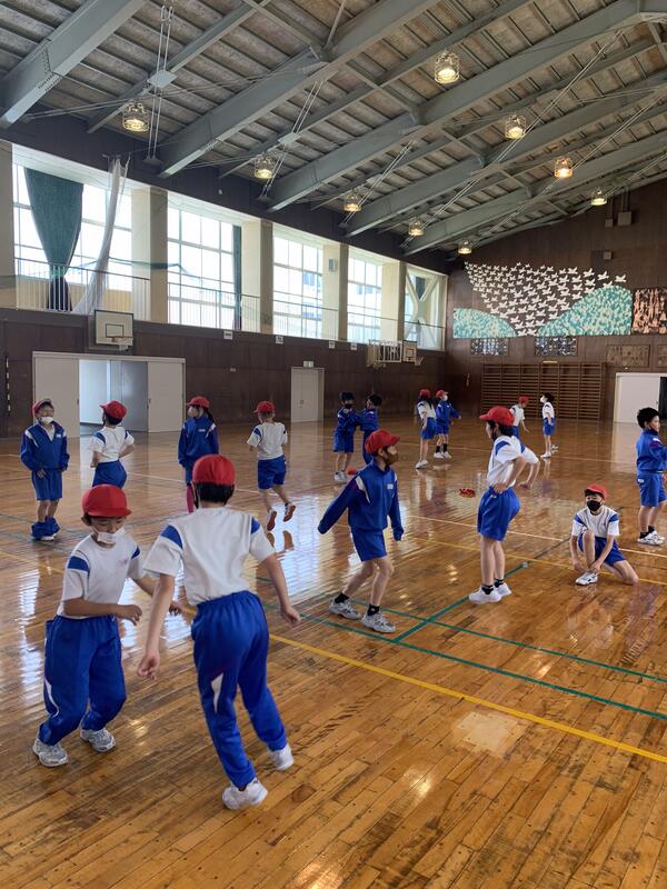 体育で、「あんたがたどこさ」という曲に合わせてジャンプをする運動をしました。