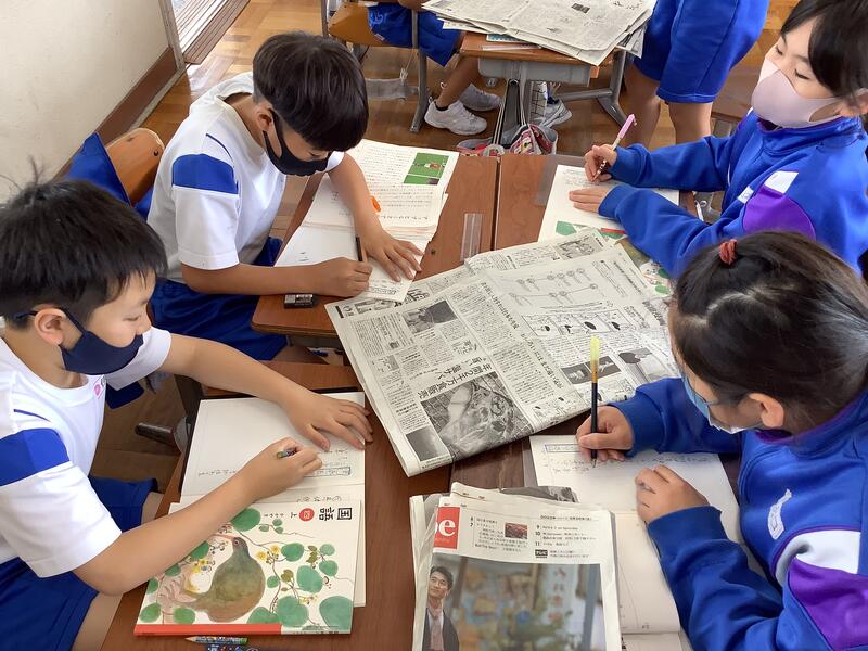 筆者の考えをとらえる活動として、新聞紙から「アップ」と「ルーズ」の写真を選び、