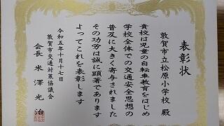 松原小学校は、7月に6年生児童が出場した「自転車大会」への取組に対して「交通安全功労賞」をいただきました。