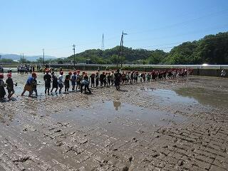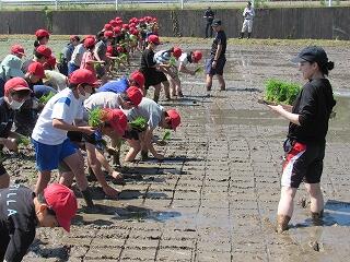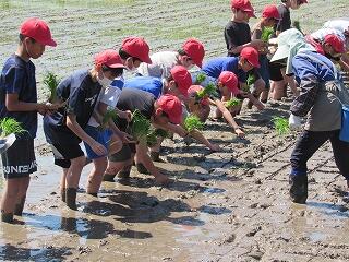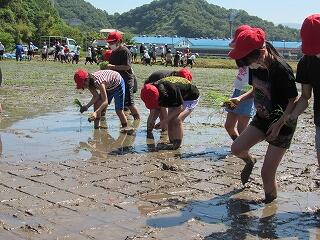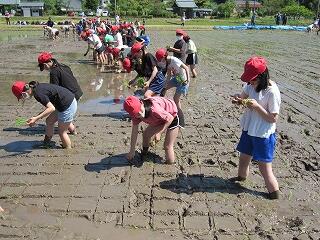 五月晴れの清々しい青空の下、5年生が田んぼの学校で田植え体験を行いました。