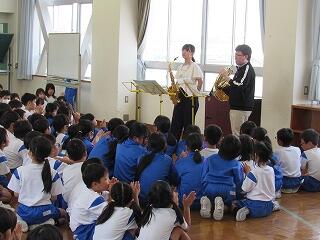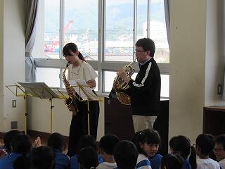 昼休み、楽器が得意な2人の先生がミニコンサートを開きました。