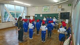 校庭に集合する前に教室でラジオ体操をして体をほぐしました。