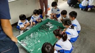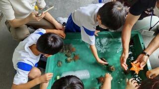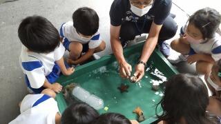 先生から魚や貝、ヒトデなどの名前や体のつくりを教えていただきました。