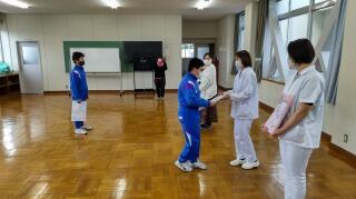 新型コロナウィルス感染症の現状を踏まえ、代表児童から調理員さん、用務員さん、学校栄養職員さんに感謝のプレゼントを贈呈する形で行いました。
