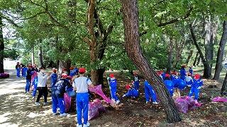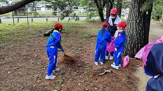 6年生のSDGsの取組のひとつ「陸の豊かさも守ろう」グループが、1年生に呼びかけて、一緒に松葉かきをしました。