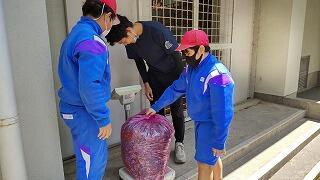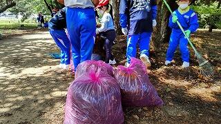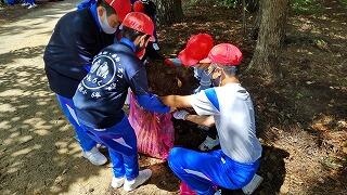 ゴミ袋を押さえたり、「すごい」などの言葉をかけたりしながら、1年生を励まします。