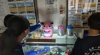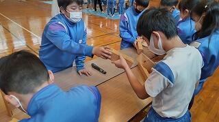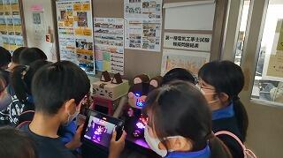電気科の生徒さんたちが作った作品を見て、たくさんの児童が目を輝かせました。