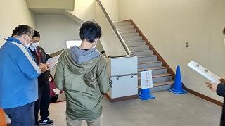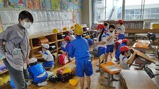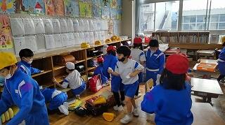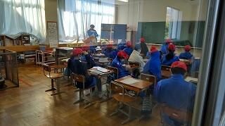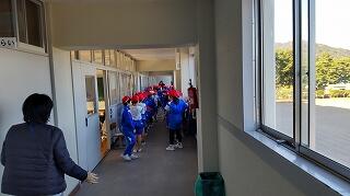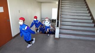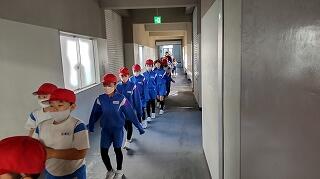 避難ルートの確認ができたことを全校に知らせ、1階と2階にいる児童は、3,4階へ避難を開始します。