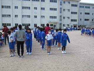 校庭に整列して人数確認。