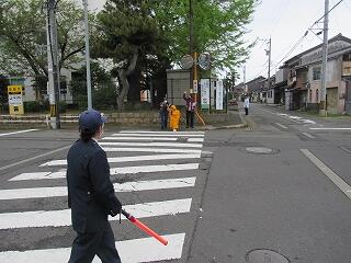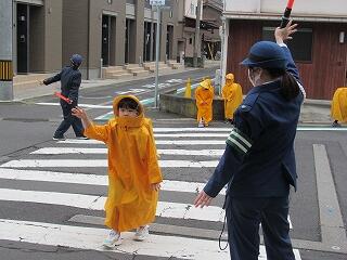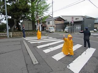 横断歩道の渡り方をしっかり聞いて、学校前で実際に一人ひとりやってみました。