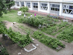中庭 1年生から6年生がそれぞれ野菜や花を植えています。昼休みには、みんなの遊び場になっています。 |