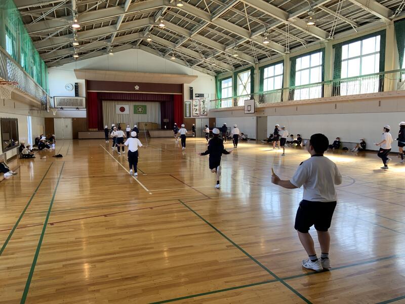 まず、8つのグループに分かれて、大縄対決をしました。6年生が3年生に、入るタイミングを教えてくれたり、元気よく数を数えたりする姿が微笑ましかったです。
