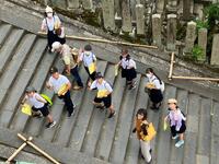 ボートは三方湖までみんなで運ばなければいけません。ゴムボートですが重い! みんなで力を合わせて運びます。