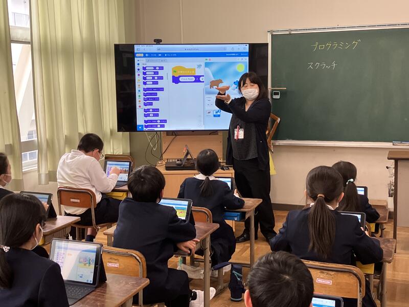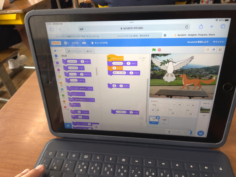 プログラミング学習を行いました。タブレットを使い、自分の選んだキャラクターたちを動かしてみたり、会話させてみたりと、自分たちで考えてプログラミングをしました。
