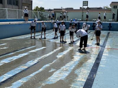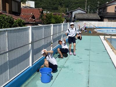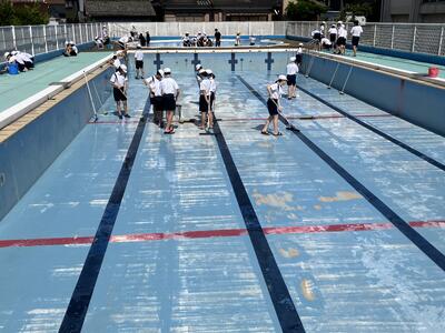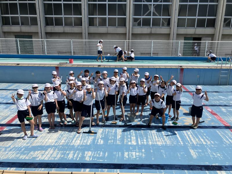 12日、5年生、6年生が力を合わせてプールの掃除を行いました。初めは泥で汚れていたり、草が生えたりしていましたが、一生懸命掃除をすることでピカピカになりました。