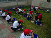 教室で手順を確認して、いこいの庭へ出発!土に肥料を混ぜてあさがおのベッドをつくり、6つの部屋(穴)に種を寝かせて、ふんわり土のお布団をかけて完了です。みんな上手に種まきができました。