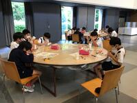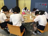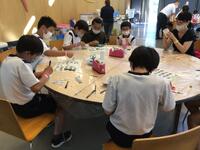 最後の金津創作の森では、サンドブラスト体験をしました。ガラスのコップに模様をつけるため、テープを貼ったコップに絵を描き、カッターナイフで切り取る作業をしました。