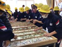 はじめに、紙漉きのやり方をよく聞き、一人ずつ和紙の材料が入っている「ふね」に「わく」を入れて和紙を作ります。