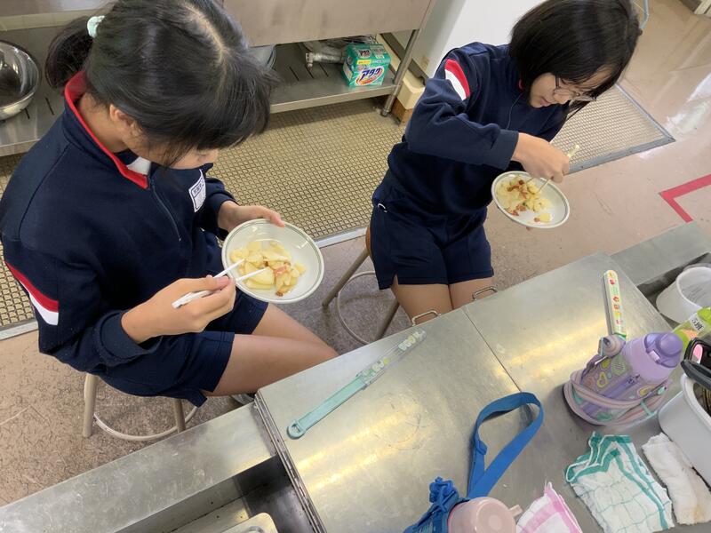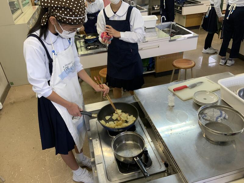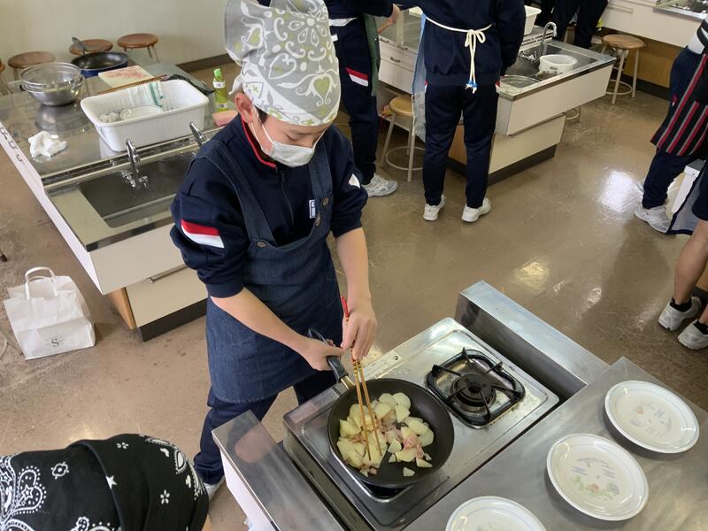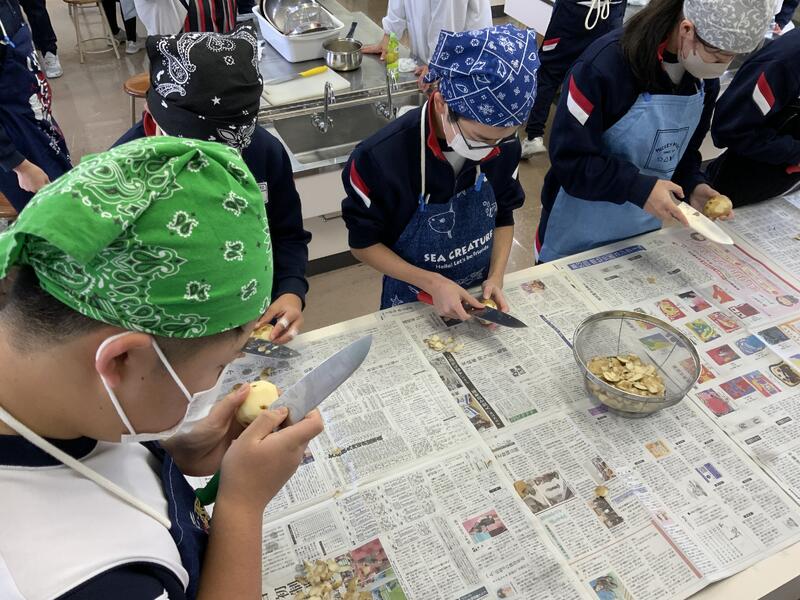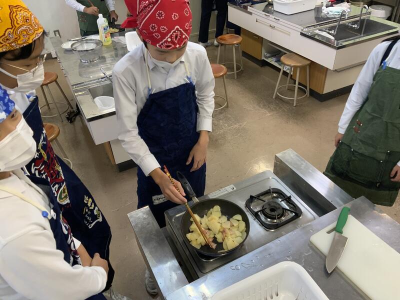 家庭科の授業で、調理実習をしました。じゃがいもの皮を向いたり、ベーコンを炒めたりしました。