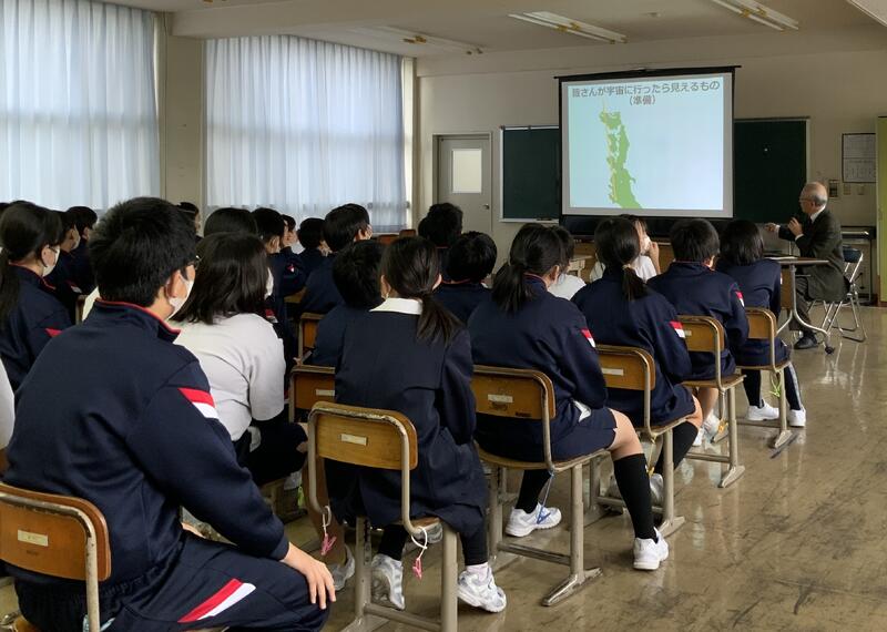 福井工業大学客員教授の加藤善一先生にお越しいただき、特別授業をしていただきました。人工衛星を打ち上げる仕組みや人工衛星の技術を用いて見える地球の様々な姿を教えていただきました。