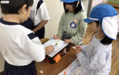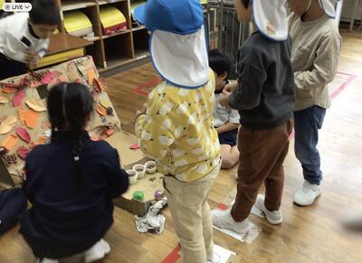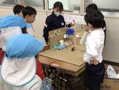 1年生が作ったおもちゃで遊びのコーナーを作り、年長組さんにお客さんになってもらって活動しました。