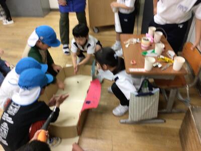 12月5日に、校区内の幼稚園・保育園の年長組さんが学校に来てくれました。1年生の教室で、どんぐりやまつぼっくりで作った「秋のおもちゃ」で一緒に遊びました。