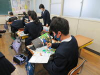 5年生は、今年初めて色版画に挑戦しています。板にいろいろな色をぬって刷る地道な作業です。集中して作業を進めていました。