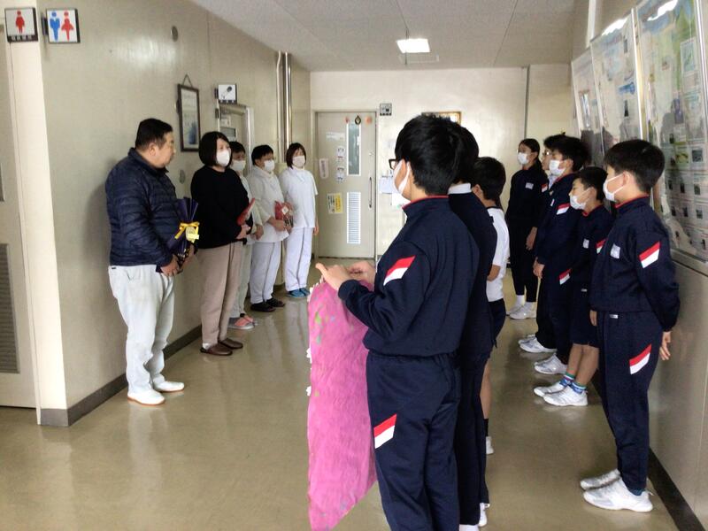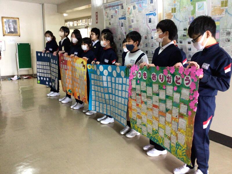いつもお世話になっている調理員さん、用務員さん、栄養指導の先生に、健康委員会が代表して、感謝の言葉を伝え、プレゼントを渡しました。縁の下で支えてくださっている方々への全校からのメッセージは、季節ごとに給食室前に掲示します。