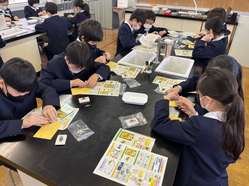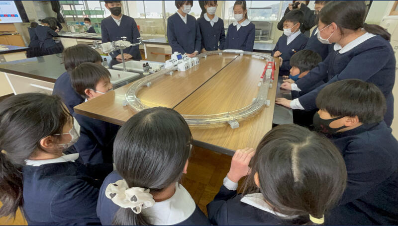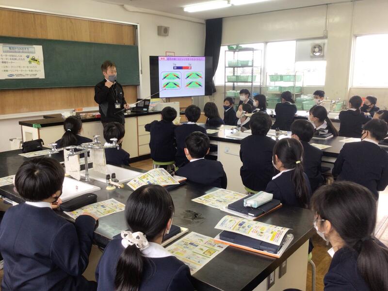 講師の先生に来ていただき、理科「電流がうみ出す力」の出前授業を行いました。身の回りにあるモーターを利用しているもの、モーターの仕組みについて、工作を通して学びました。また、磁力による浮き上がり、リニアモーターカー模型が高速で走る様子も見ることができました。