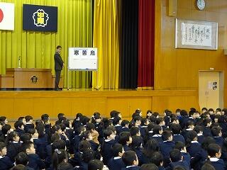 全校集会では、校長先生よりインドに伝わる「寒苦鳥」の