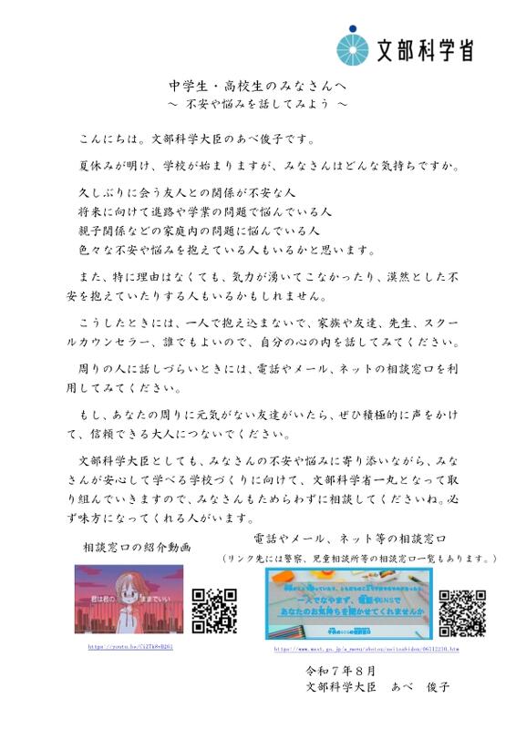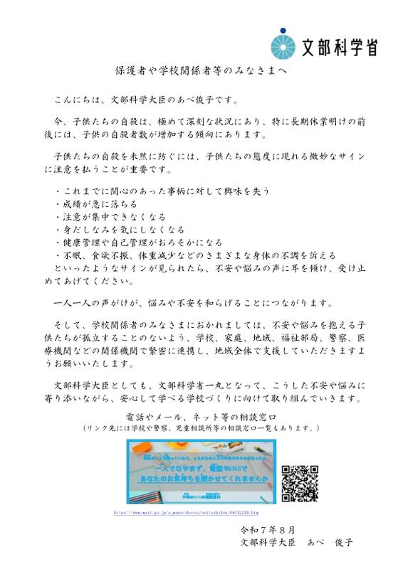 自殺対策強化月間(毎年3月)及び新年度を迎えるにあたり、児童生徒や学 生等に向けた自殺予防に係る文部科学大臣メッセージ