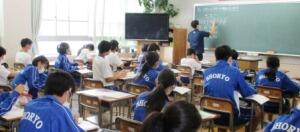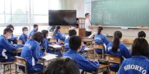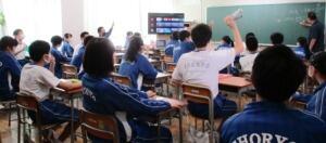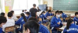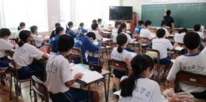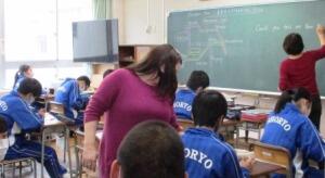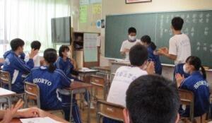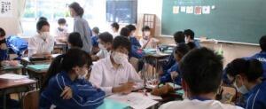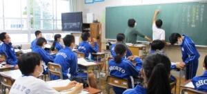 グループで課題に取り組んでいるのを笑顔で見ているのは教育実習の先生。