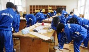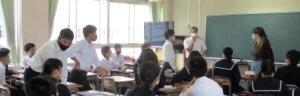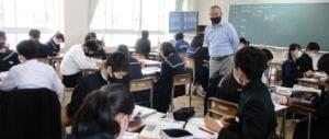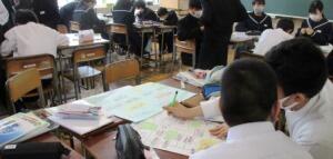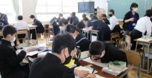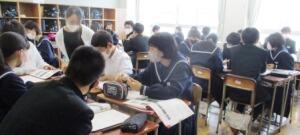 写真は、プリントの英文を完成させ、教科書で確認している場面。