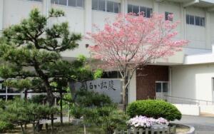 生徒玄関前の園庭は、マツの深い緑とハナミズキの淡いピンクと色鮮やか。