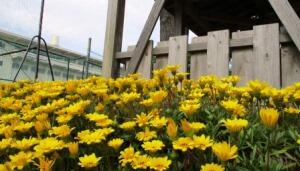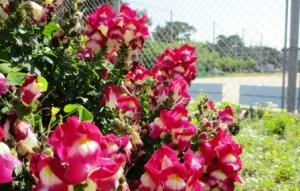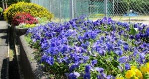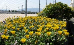 いろいろな花が咲く、グラウンド横の花壇。