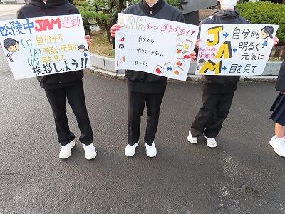 生徒会執行部が提案した「JAMあいさつ」を推進するため、執行部とボランティア委員会が玄関前であいさつ運動を行っています。活動によって意識も変わりはじめ、しっかりと「自分から・明るく元気に・目を見て」あいさつをできる生徒が増えてきました。