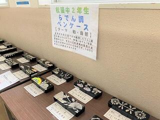 2年生が美術の時間に作成した「らでん風ペンケース」が廊下に飾られています。らでん(螺鈿)とは若狭塗り箸にも用いられる貝などを使って装飾する技法で、今回は銀色のシールを使って作成しましたが。らでん技法を使った本物にも劣らない素敵な作品が多数できあがりました。