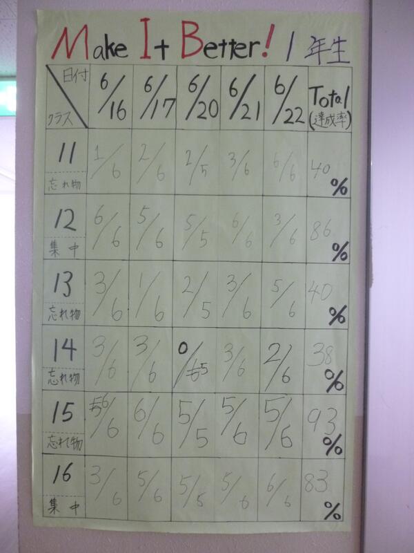 このMIBは、各学級で毎日の授業後にチェックしている「今日の授業」のチェック項目(チャイム席・忘れ物・あいさつ・集中)の中で、特に改善を必要とする項目一つを決めて、その改善をめざしていくものです。