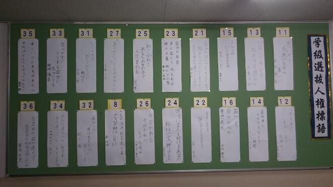 先日個人で作成した人権標語は、各学級で投票により代表作品が決まり、生徒玄関の所に掲示されています。