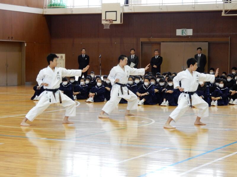 社会体育での活躍紹介では、空手で活躍しているK君、H君、K君による見事な演武と、ゴルフで活躍しているM君の力強いスイングを行いました。