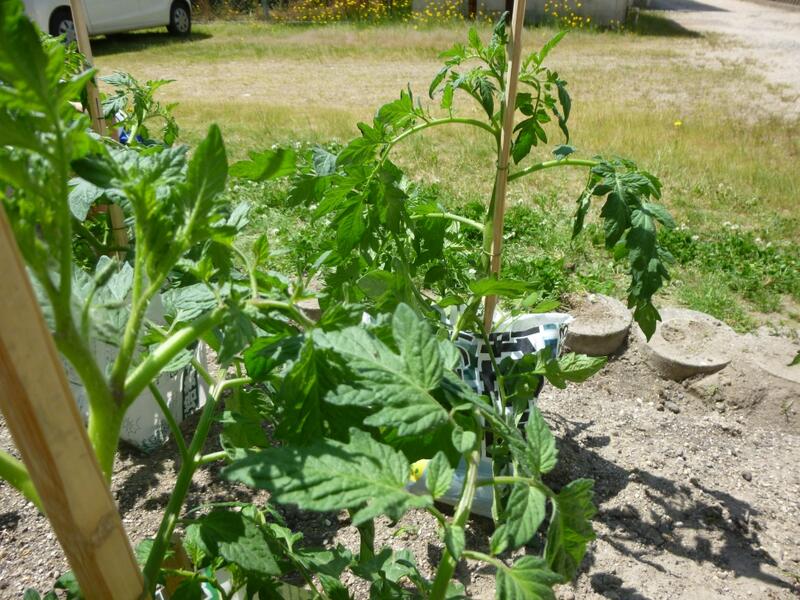 今日は、草取りや苗が倒れないように補助木に縛ったりしました。