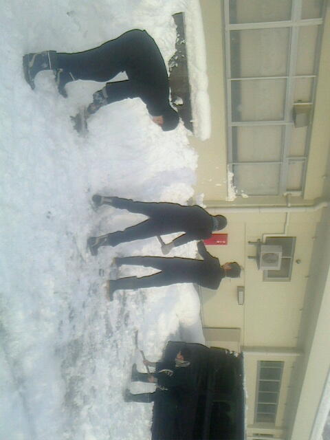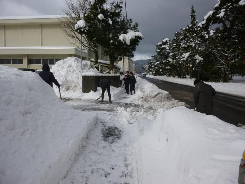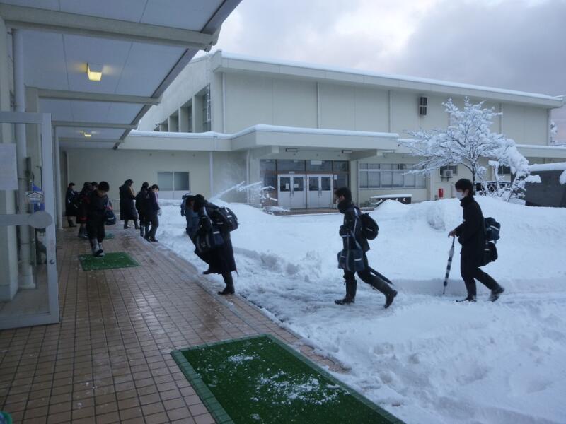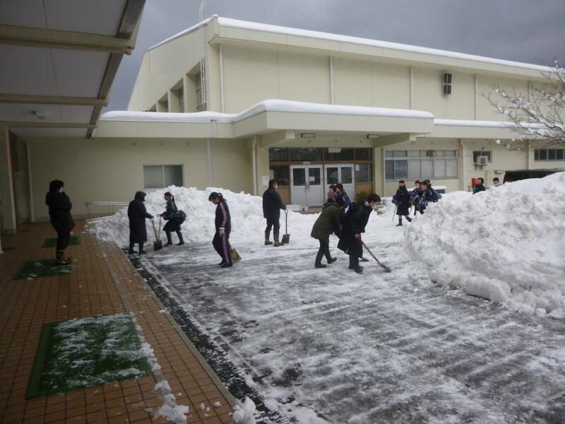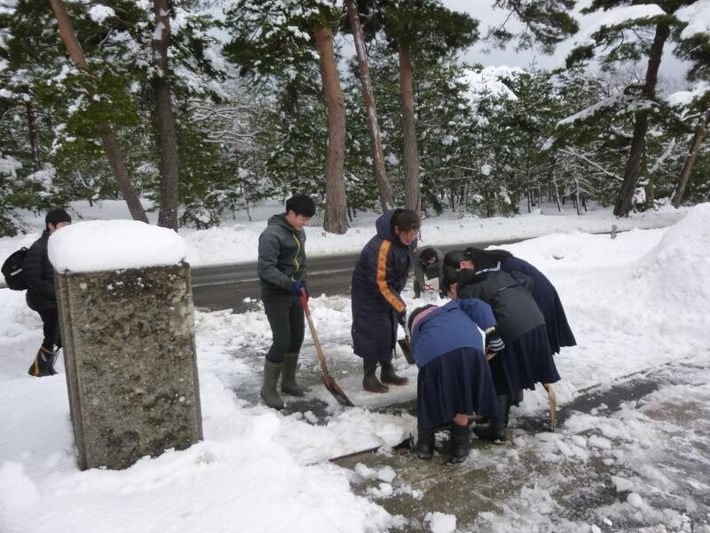 家庭の都合などもあり、いつもとほぼ同じ時刻に登校する生徒もいましたが、その生徒の中には自主的に玄関前の除雪に協力する生徒も。