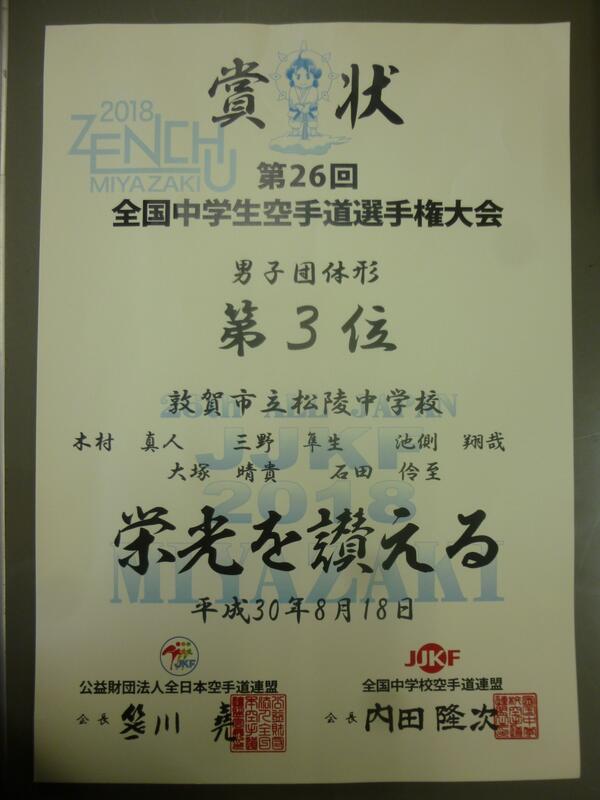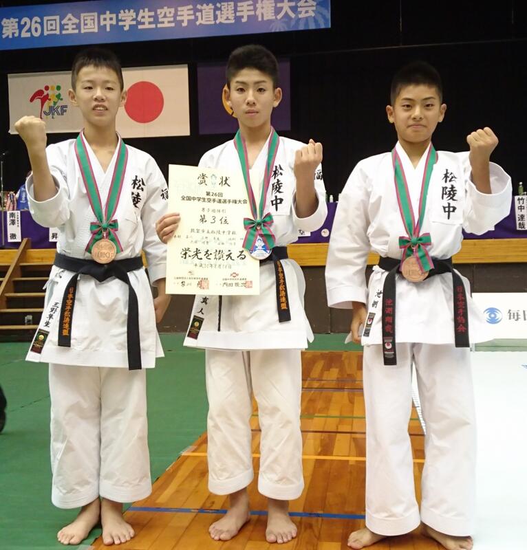 今月17日から宮崎市で行われている全国中学生空手道選手権大会の男子団体形の部門で、見事3位となりました。
