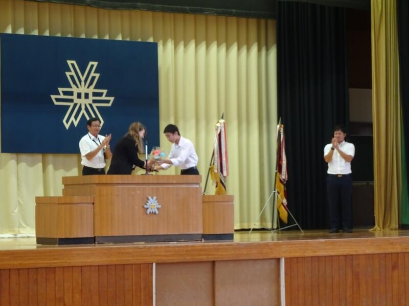 また、新しく松陵中にALTとしていらっしゃったニーヴ・クロズビー先生の新任式がありました。緊張している様子でしたが、挨拶のスピーチを日本語で一生懸命してくださいました。