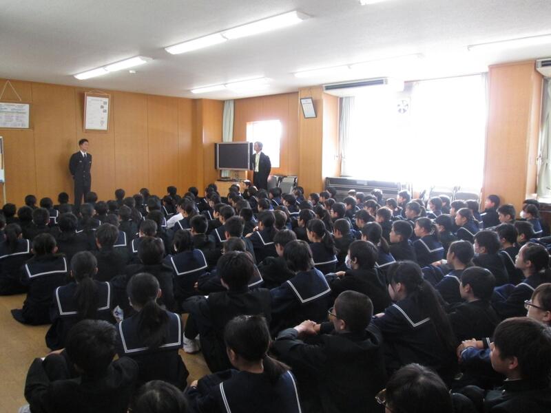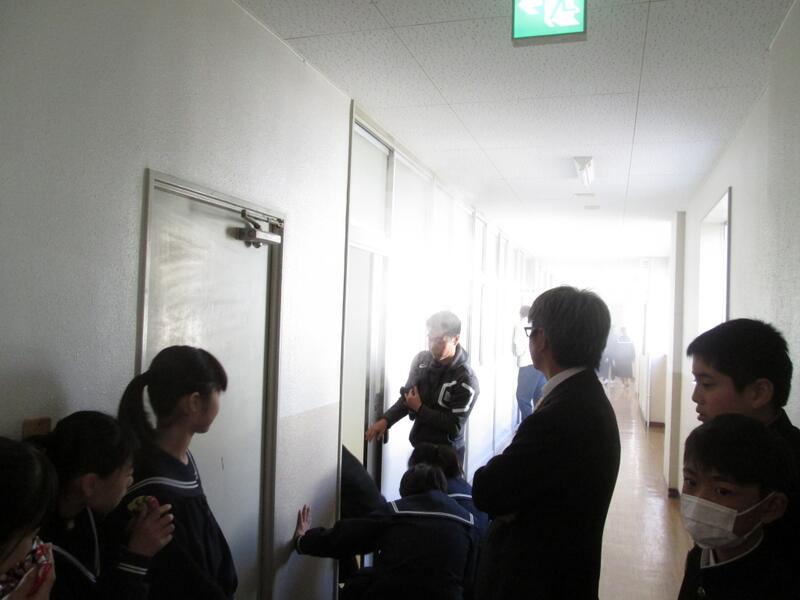 11月12日の3限目と4限目に、敦賀美方消防組合予防課の職員の方に御協力頂き、火災時の煙に対する訓練を行いました。教室を特別な煙で満たし、その中をどう安全に歩くかの指導をいただきました。