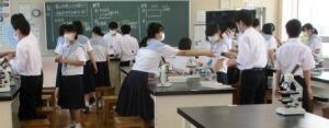 顕微鏡とヨウ素溶液を使って、光合成をしている部分を確認します。