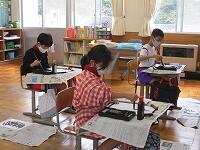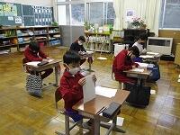 1・2年生は図工の授業。「心に残った1シーン」というテーマで描いた体育大会の絵を見せながら、振り返り作文を発表しました。4年生は書写の授業。5・6年生は社会の授業。どの学年も、集中して学習に取り組んでいます。