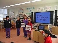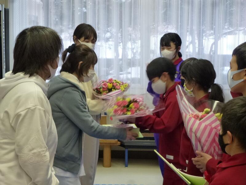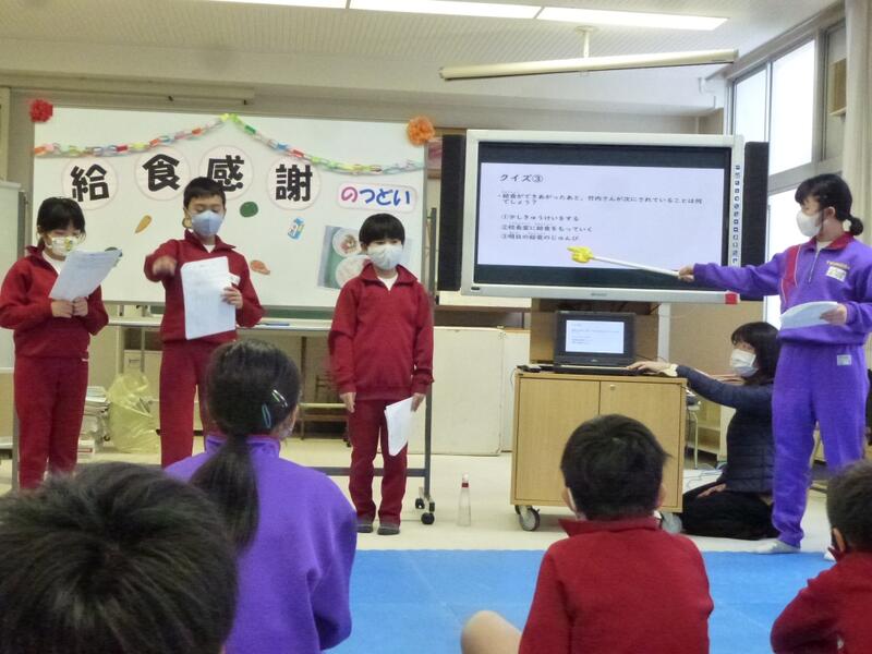 まず、花束とプレゼント(色紙とカレンダー)を渡し、感謝の気持ちを伝えました。その後、生活委員が調理員さんの1日をクイズを交えて発表しました。調理員さんの仕事や思いについて知ることができました。