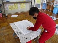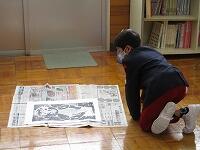 子どもたちはホールに集まり、デザイン画を見ながら30センチ四方の土台に手際よくタイルを置いていきました。10枚の土台を組み合わせると花火のデザインが浮かび上がりました。3校で土台を約150枚作り、角鹿小中学校のトイレの壁に貼られます。出来上がりが楽しみです。